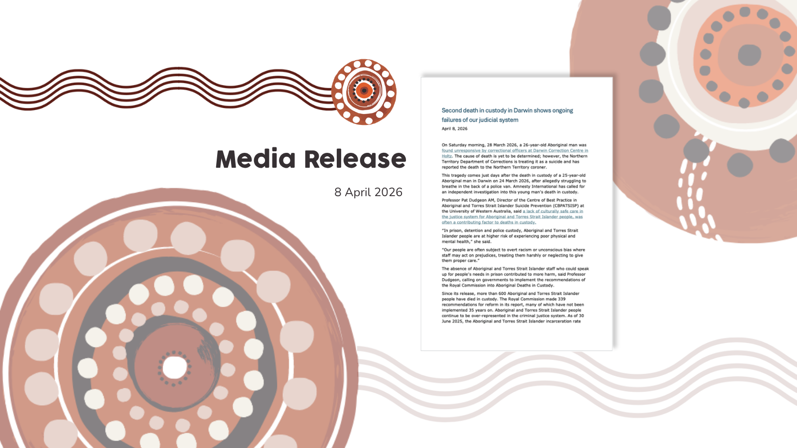On March 28, a 26-year-old Aboriginal man was found unresponsive at Darwin Correction Centre just days after the death in custody of a 25-year-old Aboriginal man in Darwin. These recent events highlight the lack of improvement in our criminal justice system to protect First Nations peoples from harm.