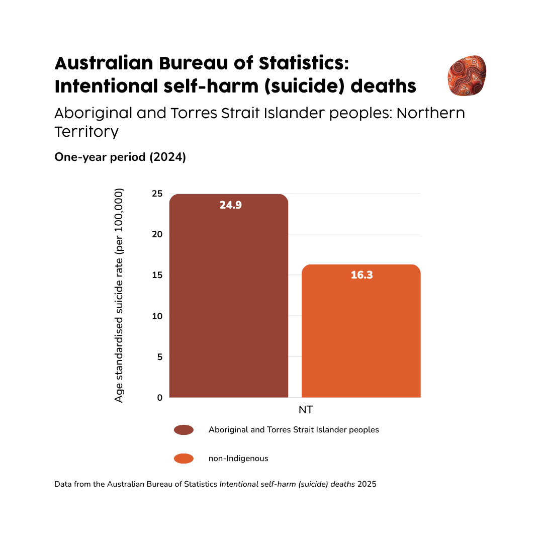 In the latest Commonwealth Government Closing the Gap annual report released in March 2026, the National Indigenous Australians Agency reported Productivity Commission statistics which show worsening rates of incarceration and suicide. In 2024, the suicide rate for Aboriginal and Torres Strait Islander peoples was 33.7 per 100,000, almost three times that of non-Indigenous people (11.3 per 100,000). For the Northern Territory in particular, suicide was the 6th leading cause of death for Aboriginal and Torres Strait Islander peoples, with a suicide rate of 24.9 per 100,000 people, compared to non-Indigenous suicide rate of 16.3 per 100,000 people.