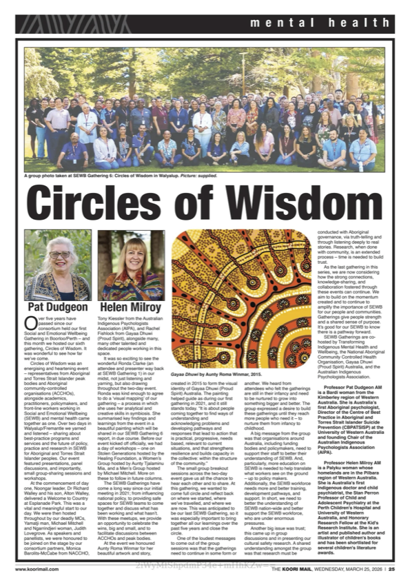 She was the first Indigenous Australian psychologist, and is currently the Director of the Centre of Best Practice in Aboriginal and Torres Strait Islander Suicide Prevention (CBPATSISP), funded under the Commonwealth Government’s National Suicide Prevention Leadership and Support Program and based at the University of Western Australia. She is also a Chief Investigator on an NHMRC Million Minds Mission Grant, Transforming Indigenous Mental Health and Wellbeing.