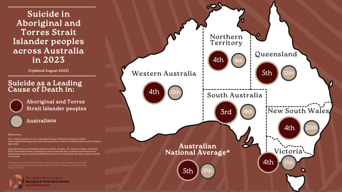 In 2022, suicide accounted for 4.7% (239/5082) of all deaths of Aboriginal and Torres Strait Islander people. For comparison, suicide accounted for 1.62% (3010/185,857) of all deaths of non-Indigenous people.